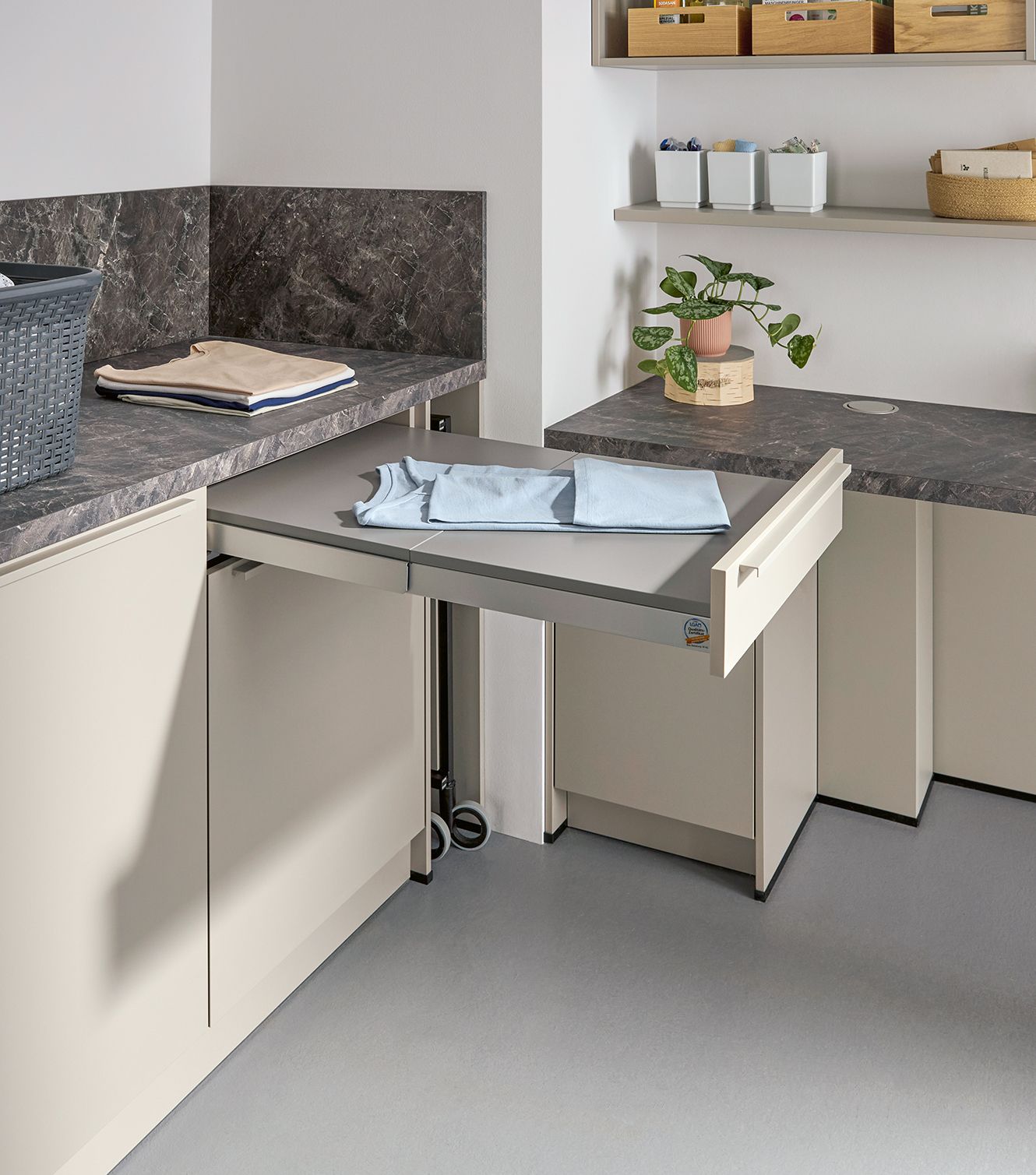 Whether with a clothes rail for airing and drying clothes or support panel top shelves for additional storage space, the top shelf unit is highly versatile. What’s more, it comes with optional LED lighting and a pull-out table which can be used as a workspace. It is available in widths of 80, 100 and 120 cm and can be placed on top of all base unit models in the utility room collection.