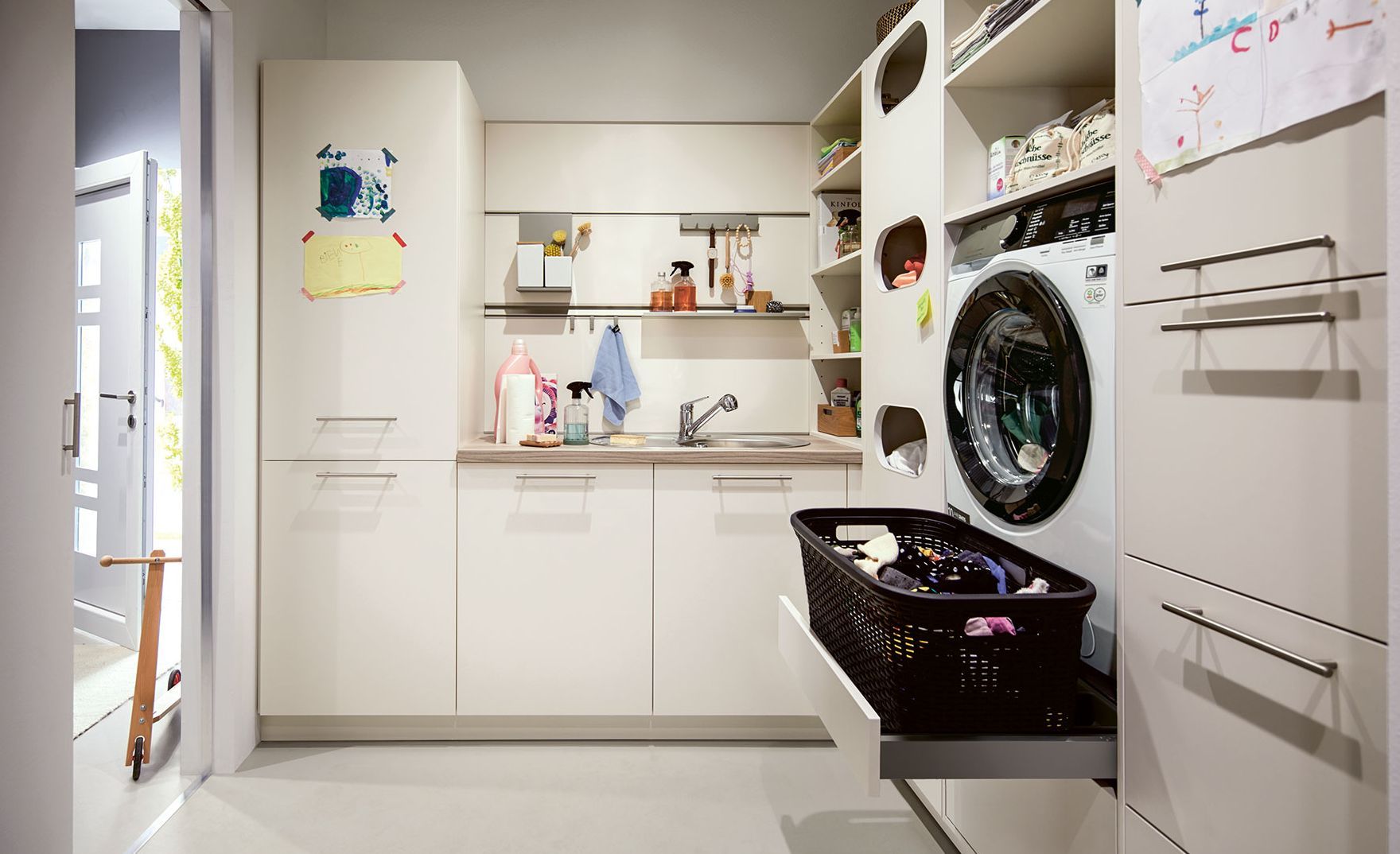The utility room by Schüller – a perfectly planned work area in which you are happy to dry washing out of sight and tidily store away food and drink, cleaning products and even shoes. Everything in one place, exactly where it is needed. Too good to be true?